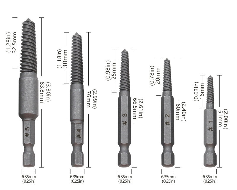 Комплект екстракторів для зламаних болтів з шестигранником, 5 штук
